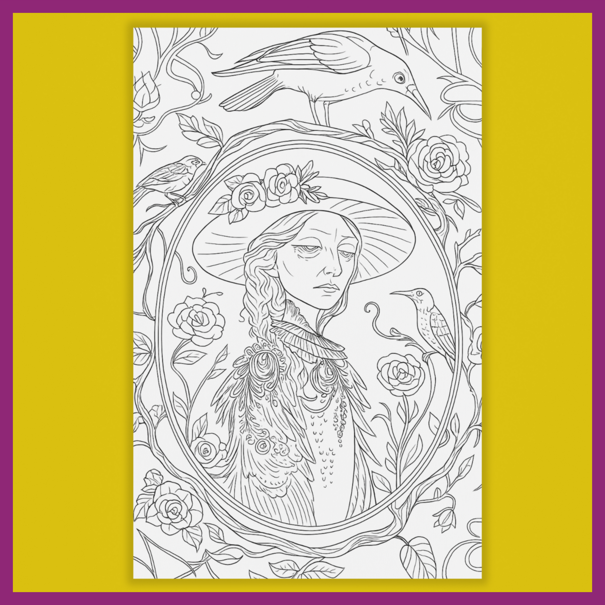 A melencholy looking lady with a crow is on this cotton panel canvas for you to paint!
