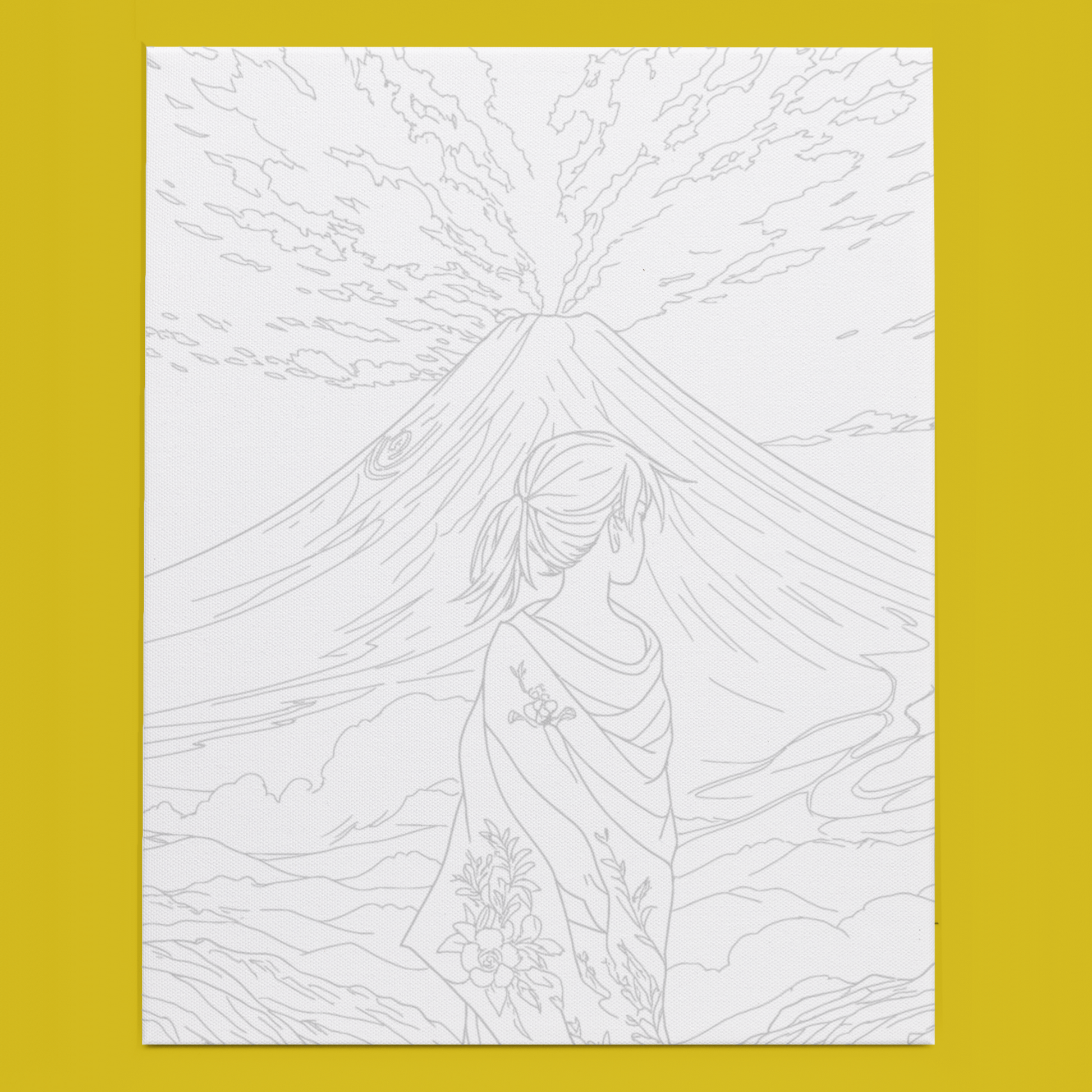 A girl gazing at an awesome landscape is featured on this cotton panel canvas for you to paint!