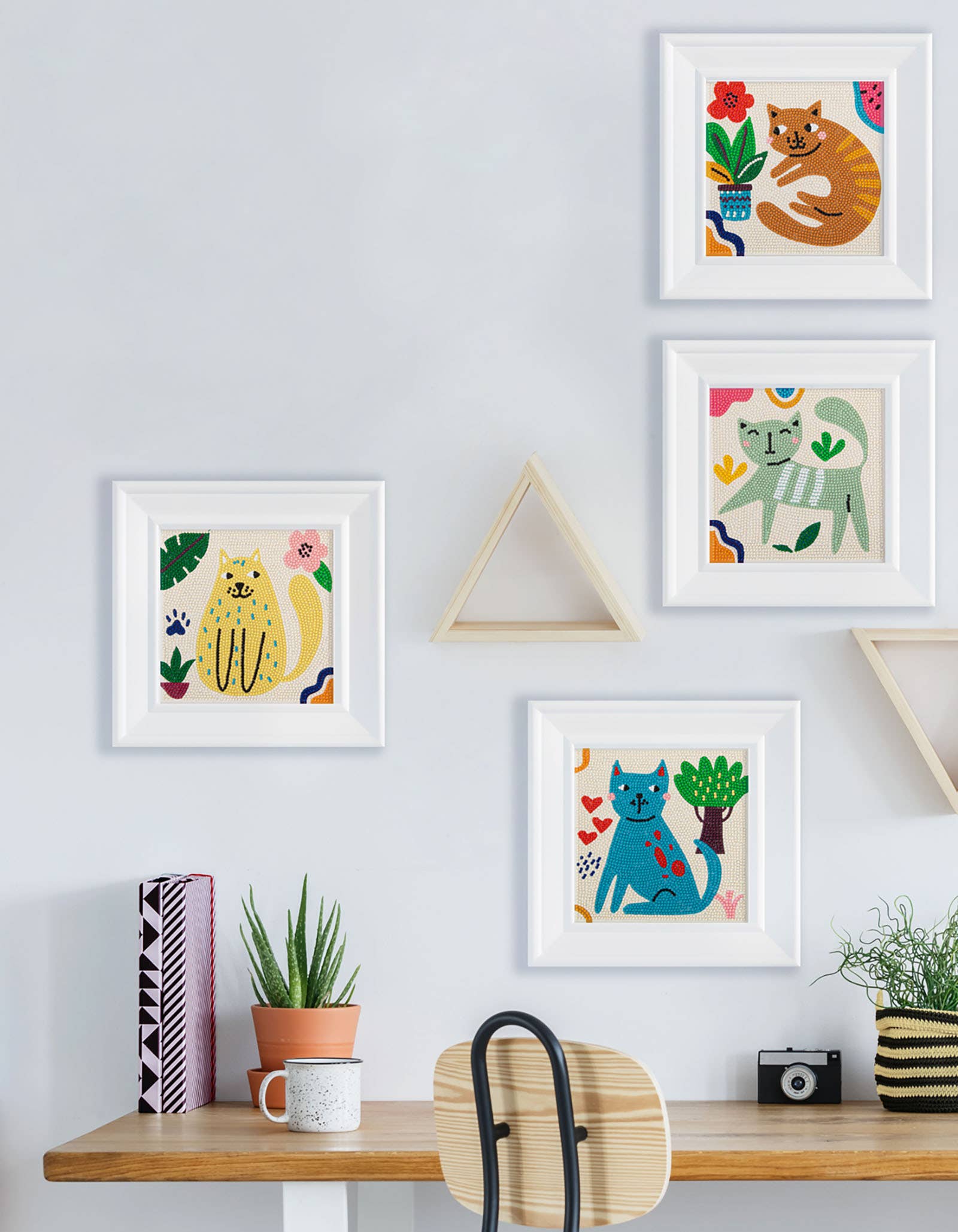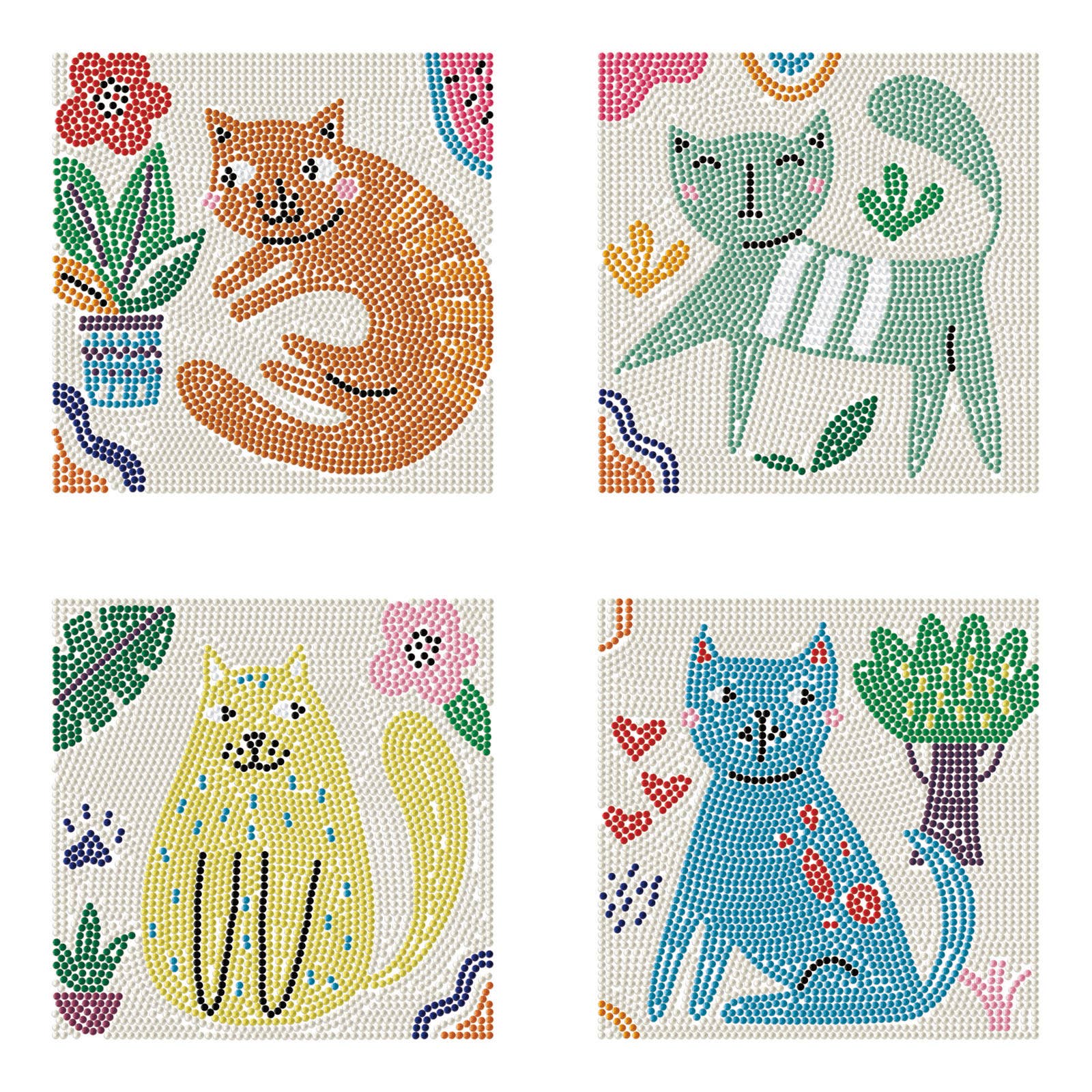 This vibrant set features four uniquely patterned kitties in charming palettes perfect for fans of Diamond Art Kits who adore playful modern cat designs.