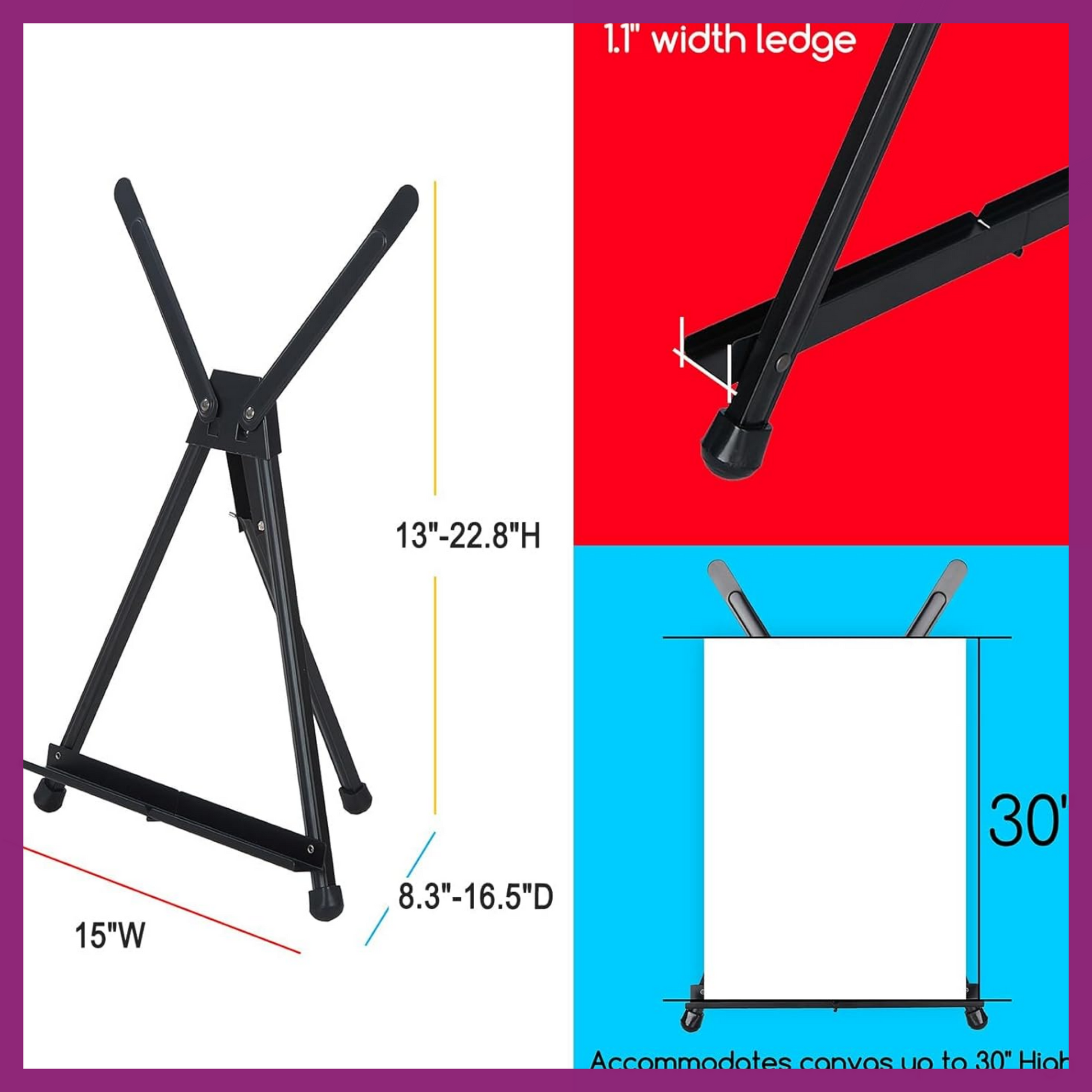 - Compact Size - Single easel collapsed size 3.7" wide by 16.1" height. Unfolded size 15" wide by 16.5"max depth by 22.8" max height. Support bar width 13.4" and bar tray depth 1.1". Easel weight 1 lb.