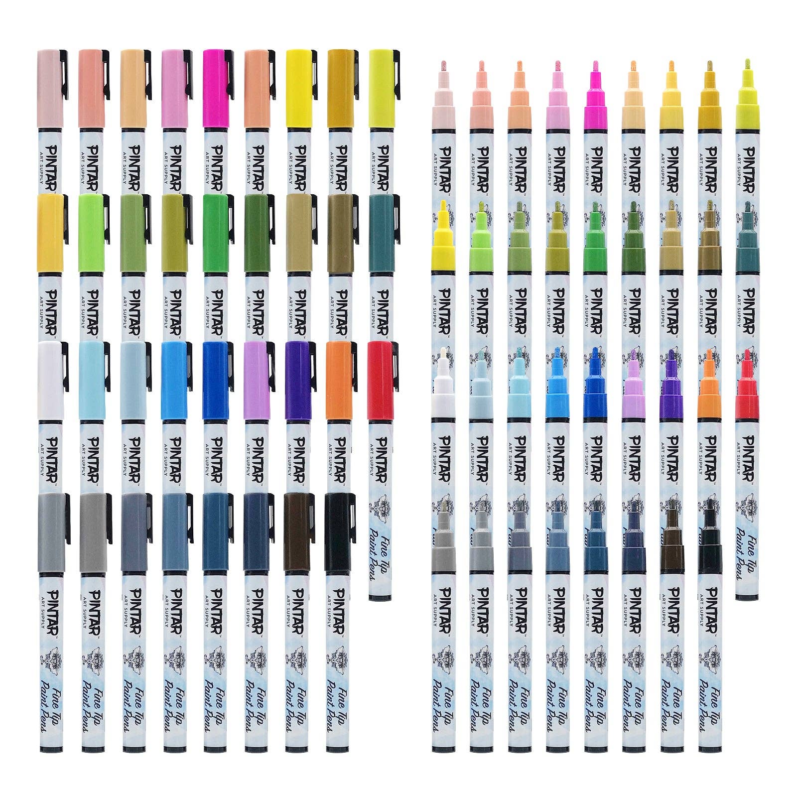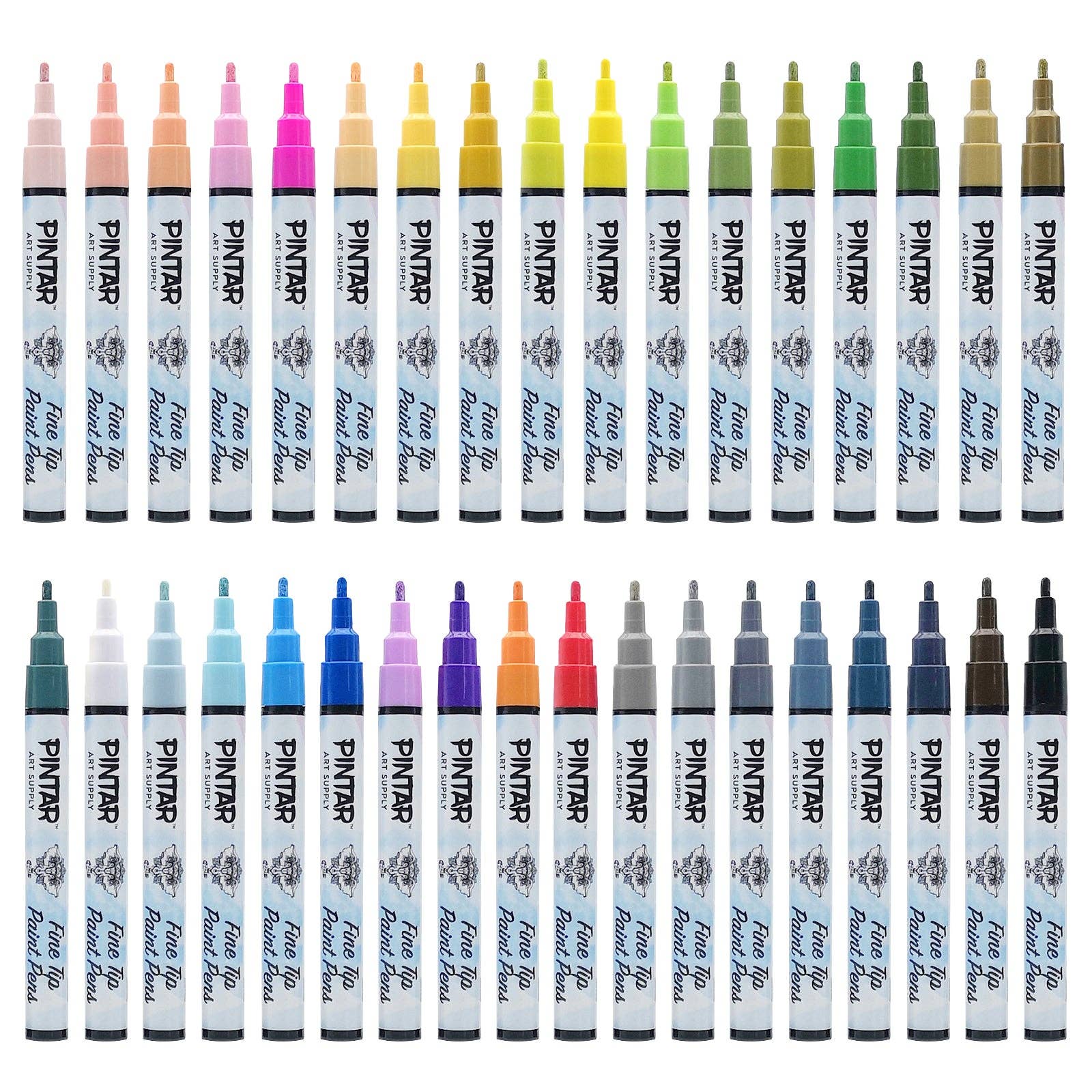 - PREMIUM ACRYLIC COLORS - Pintar (35-Pack) Fine Tip Paint Pens, highly pigmented acrylic paint ink dries quickly to produce a very durable opaque and glossy finish on light and dark surfaces. They can be used to add writing, calligraphy, and embellishments to virtually any surface.