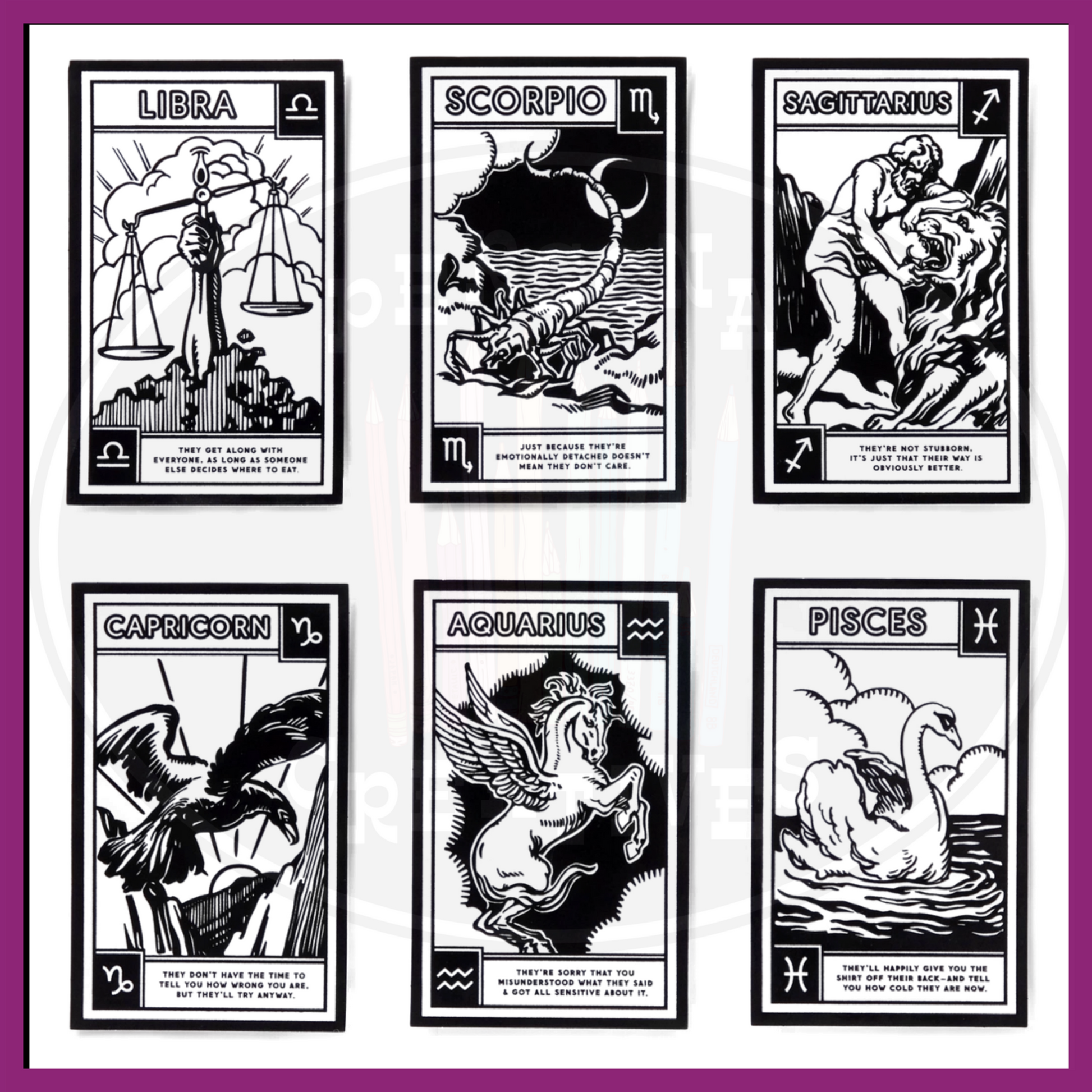 • Features all twelve zodiacs - each with a specific (humorous) 'trait' of the sign.
